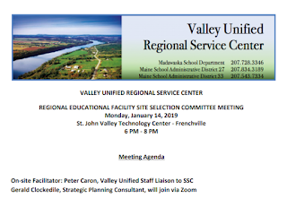 The Valley Unified Educational Facility Site Selection Committee will hold its second meeting on Monday, January 14, beginning at 6 PM at the St. John Valley Technology Center in Frenchville. To view the meeting agenda, click on the image below.